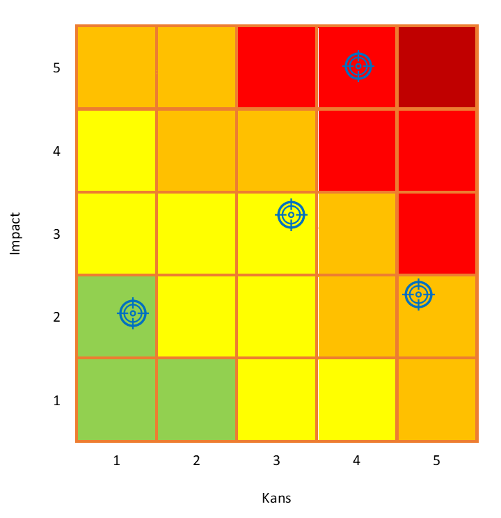 Een heatmap geeft de verspreiding van risico’s weer; hoe meer risico’s zich rechts bovenin bevinden, hoe groter de dreiging. Vice versa voor veel risico’s in de linker onder hoek. Vaak beoordelen organisaties hun risico’s twee keer: de “bruto” score geeft de risico situatie zonder aanwezige beheersmaatregelen aan, de “netto” score geeft de risico situatie mét aanwezige beheersmaatregelen aan. Deze netto score wordt ook wel het restrisico genoemd: welk risico rest mij nog nádat ik maatregelen heb genomen? De netto heatmap kan er dan zo uitzien: