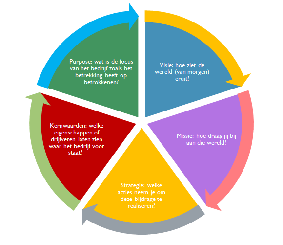 Missie: borduurt verder op de visie en geft aan hoe jij met dat wereldbeeld aan de slag gaat. Soms beïnvloed je die wereld, maak je gebruik van een situatie of voeg je er iets aan toe. Een combinatie kan ook. Hier zit vaak geen horizon aan vast.
