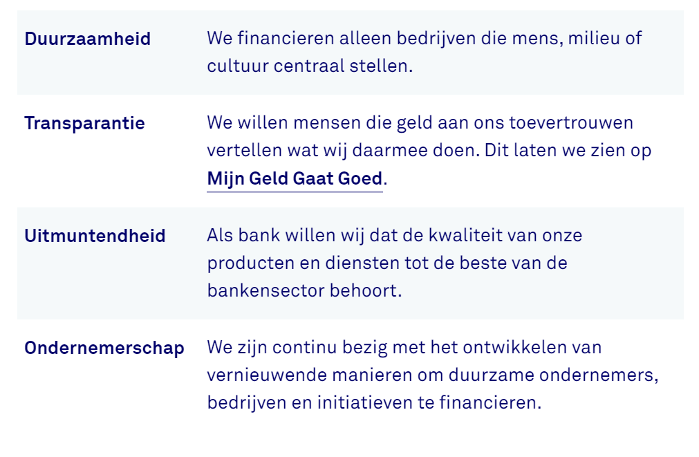 Het schijnt dat bij Triodos Bank elke beslissing aan deze kernwaarden getoetst wordt. Dus ook de bijvoorbeeld de inkoop van pennen of thee voor op kantoor. Zij willen niet in zee met een leveranciers of een product dat niet aan hun kernwaarden voldoet, dit valt buiten hun risico tolerantie.
